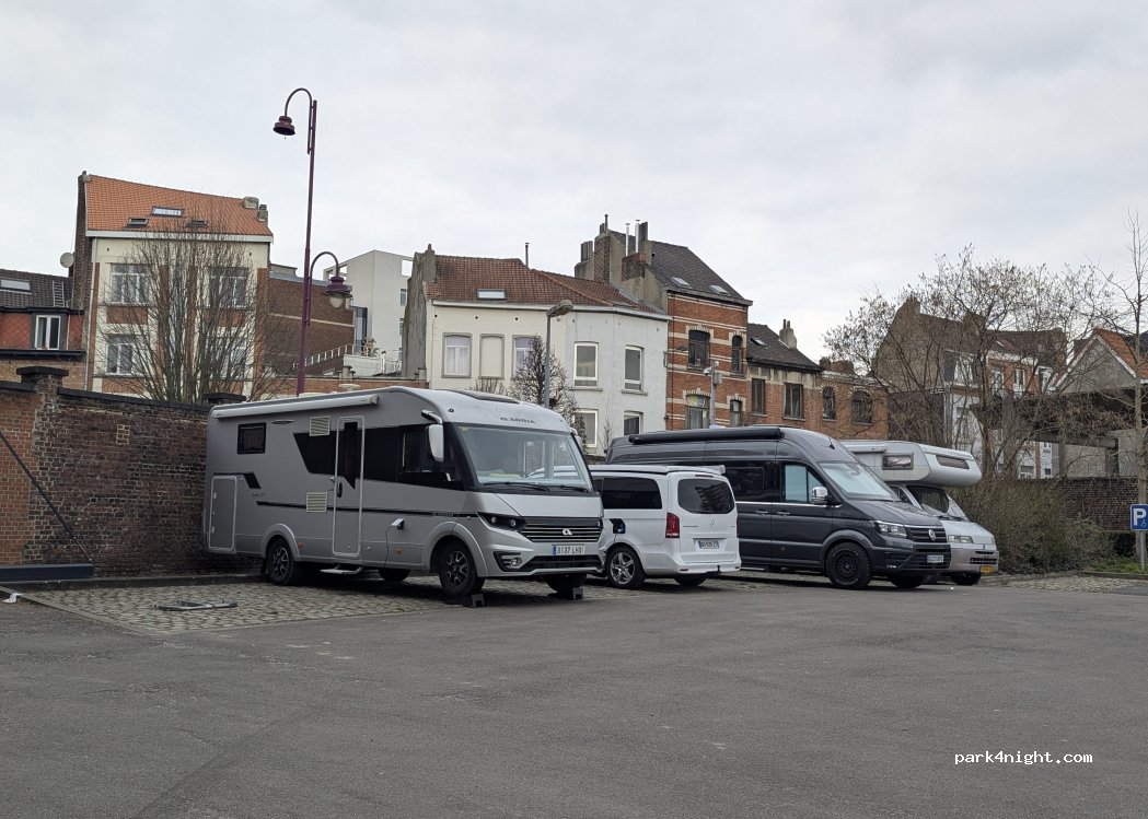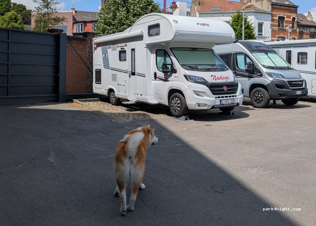 Plan your route in advance. enter the city via e19 motorway and the N274 otherwise you will be on tiny streets. exit via rue de la and the N8 taking you to the e19. Great stay at €35. electricity only at low amp. free services. your motorhome is safe in a gated compound. Max for 6.5 meters. we pushed it at 7.5 meters. reception are a delight. Only 5 spaces available. do phone or book by email.
