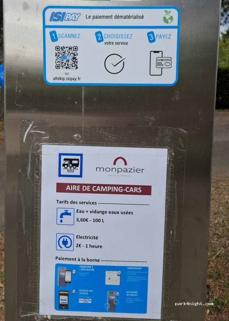 Aire très bien située, à proximité immédiate à pied du magnifique village de Monpazier. Vidange toilettes et eaux usées ok mais sans rinçage pour les WC, il faut payer pour prendre de l'eau avec scan... bref on laisse tomber. Ce qui est catastrophique dans cette partie du Périgord c'est le problème des poubelles, containers avec carte pour les résidents rien de prévu pour les gens de passage!
