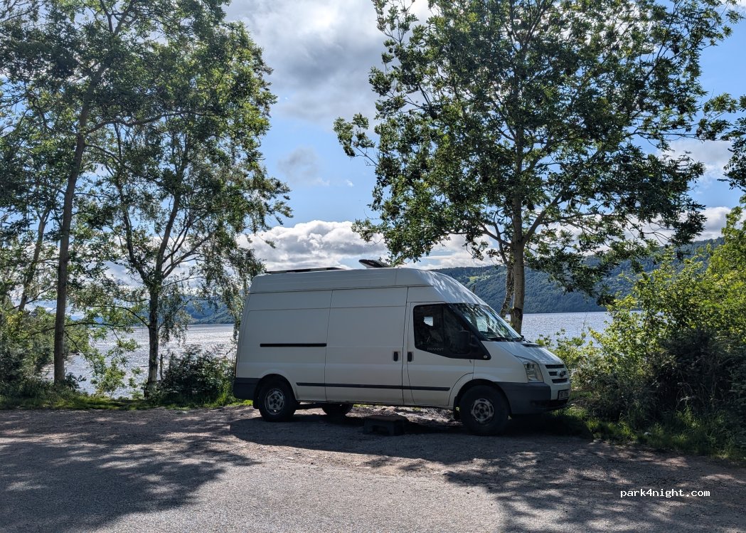 We investigated on an early December evening but the space was really muddy (we feared getting stuck), was on a camber towards the loch and felt hemmed in on quite a busy road near a bend. We decided to move on.