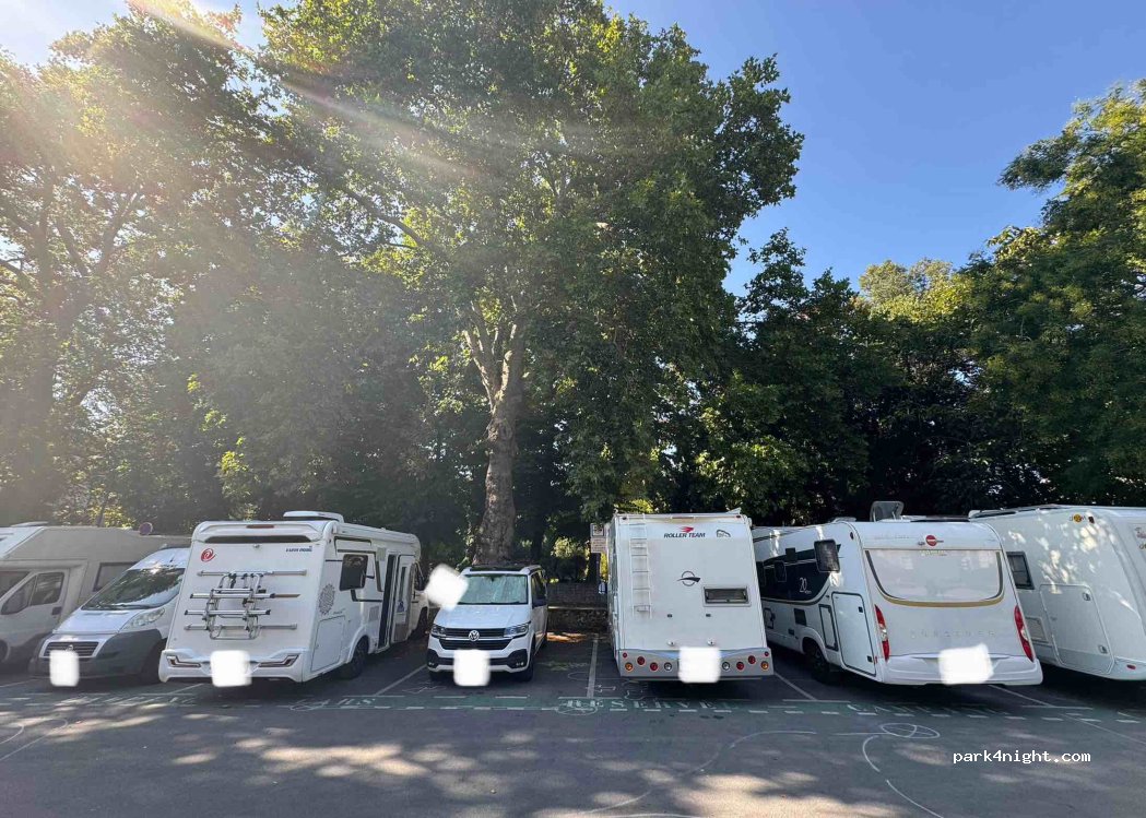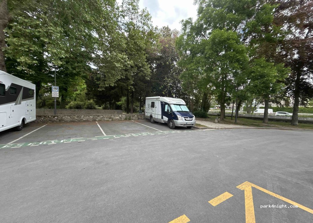 Vraiment inespéré d être dans un cadre verdoyant en ville si près à pied de la cathédrale.48 h maxi gratuit. Peu de place mais dommage que certains s octroient les places des bus......les incivilités qui forcément vont un jour exaspérer la ville de Reims......qui a du rappeler sur un tableau que l on ne doit pas verser ses eaux usées .....ni les toilettes dans les égouts.....quel dommage !!!!!