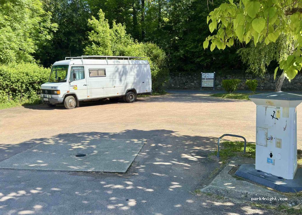 Parking mixte avec voitures, nombreuses un jour de mariage.. Mais on peut stationner librement la nuit. De l'ombre au fond du parking. Toilettes près du terrain de tennis. Borne avec jetons de 3 euros. Nuit très calme avec une belle volée de cloches de l'église à 8 h. À 200 mères d'un beau village, château, église, maisons. Un supermarché au centre.