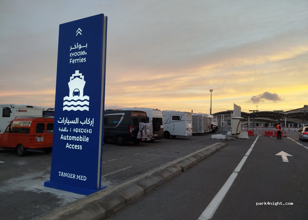 Pour les amis campingcaristes qui traversent de Tanger vers Algésiras, vous pouvez passer la nuit sur le parking a gauche après des agences de voyage à l intérieur du port de Tanger Med. Sécurisé éclairé comme un véritable terrain de foot. Bonne traversée.