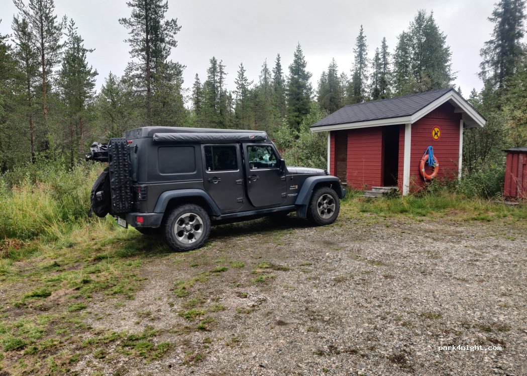 Petit emplacement caillouteux après une courte piste (correcte). Une plage devant la rivière. Seuls au monde et sur le cercle polaire. Aménagement sommaire pour la baignade.