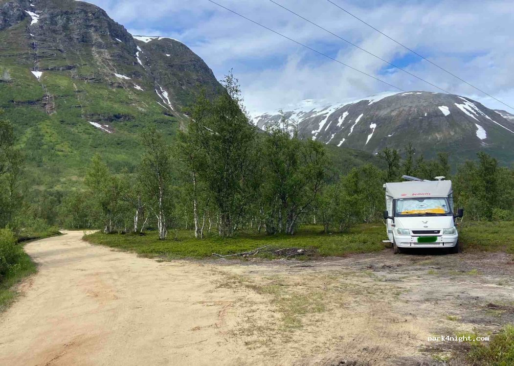 quite and peaceful place in berch forest. Good place as starting point for visit of Tromso. Place is also used as parking spot for salmon fishermen. you can walk to river from camping site