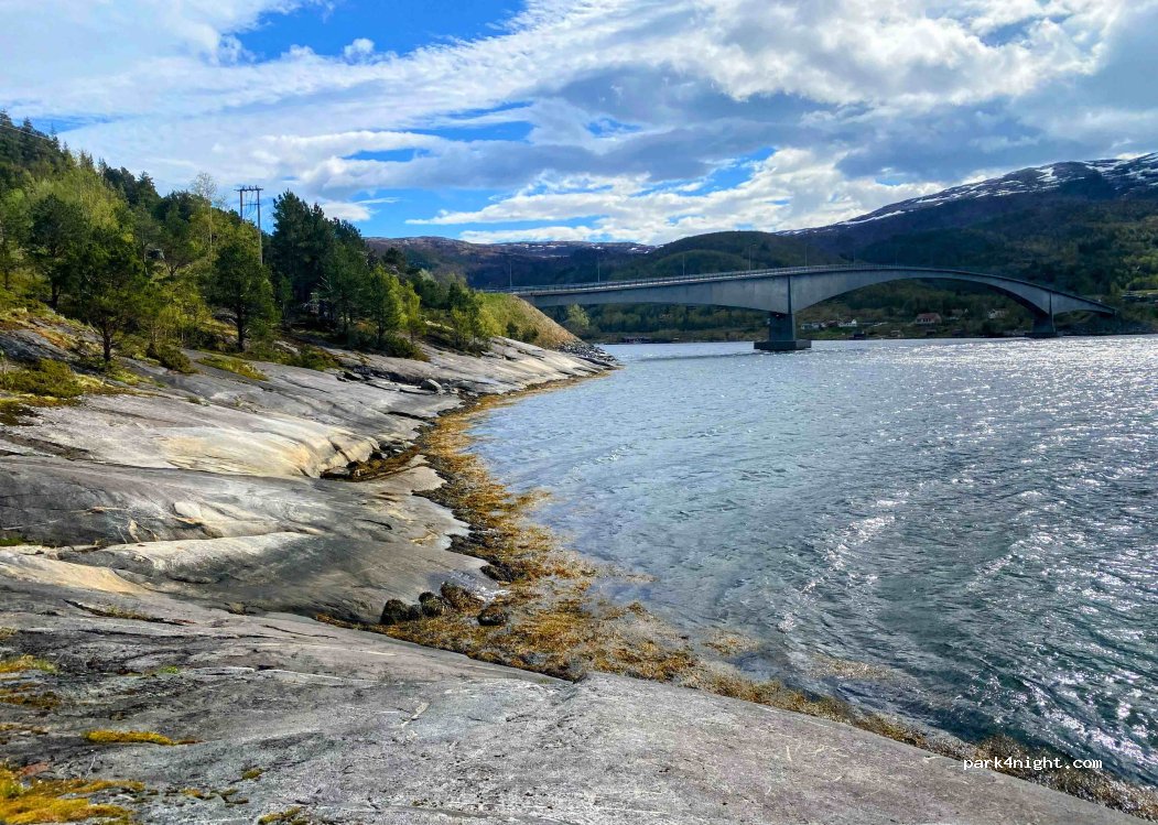 Parkplatz für etwa 4 - 5 Wohnmobile. Vorausgesetzt, dass jeder rücksichtsvoll parkt. Tolle Aussicht auf den Fjord, den man über einen Fußweg erreichen kann. Saubere Toilettenanlage.