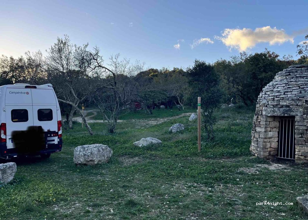Great place. Walking distance from the medieval village Aiguèze. Hikes possible to Rochers du Castelviel for a beautiful view on the Ardèche. We were all alone in November and nobody even came to collect the money. Downside is that Aiguèze is like a ghost town atm and almost every place to eat or drink is closed. View on the winefields if you pick the right spot to park the van.