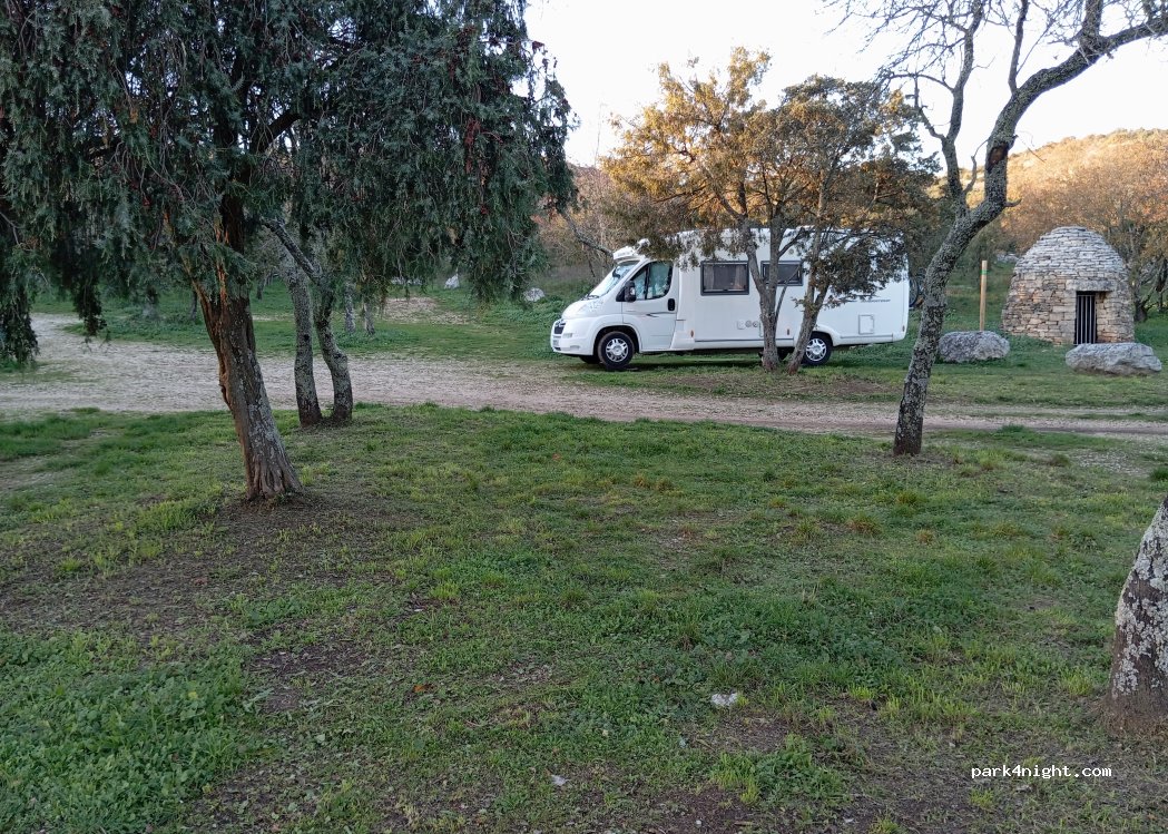 sjarmerende plass å stå innimellom oliventrær, men kort spasertur til den sjarmerende byen. Broen over elven er ikke mer enn 270 cm bred, burde nevnes. gikk fint med min bybobil. om morgenen i 0830 tiden kom en hyggelig dame å tok imot betaling på 6€ for parkering.