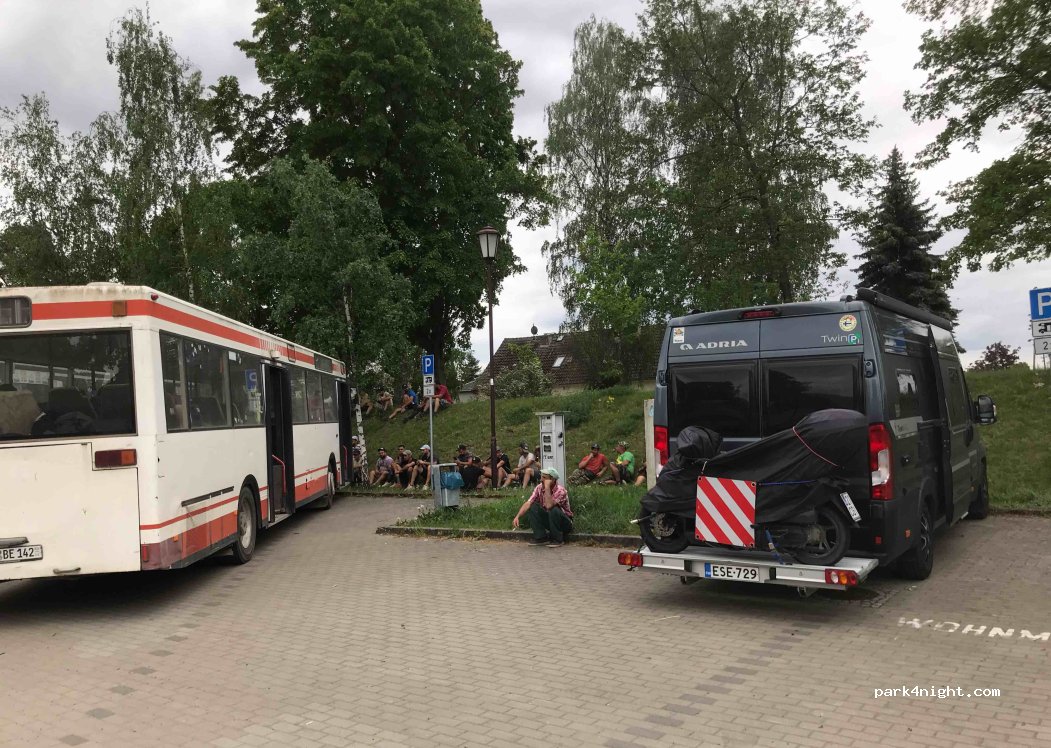 RV parking space at the rose garden. Paved space for 4 campers with power supply CEE plug via coin box. Shopping market [net market] opposite road side. Seems to be laid out quite new. Internet Vodafone LTE very good