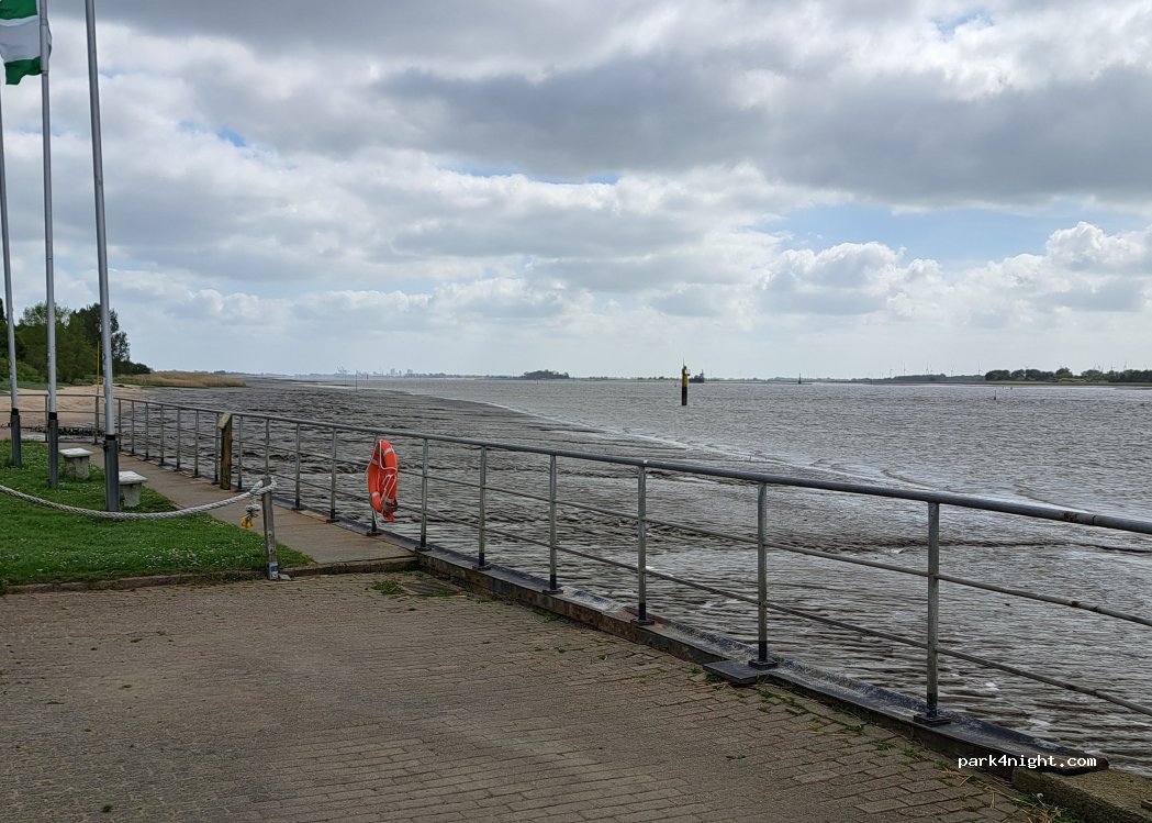 Petit emplacement pour camping-cars derrière la digue avec vue sur la Weser. Aire de jeux, terrain de football, espace barbecue, snack-bar et fish and rolls à proximité.