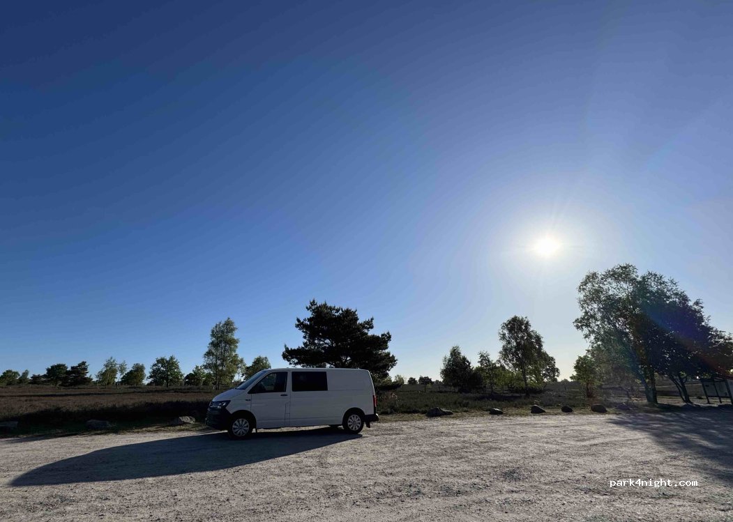 Wanderparkplatz in die Heide. Sehr zu empfehlen für ausgedehnte Wanderungen in der Heide. Der Verkehr an der Straße nimmt nachts stark ab. Nach 23 Uhr total ruhig. Durch den sandigen Untergrund gibt es so gut wie nie Probleme mit Pfützen.