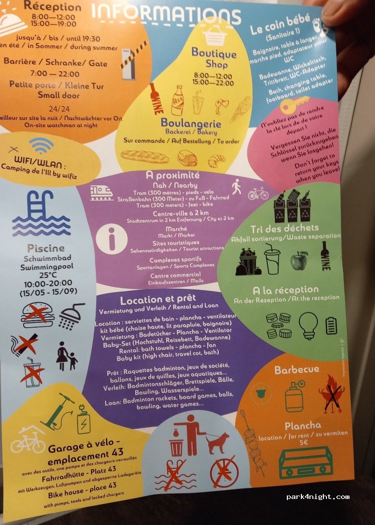 Accueil sympathique. Emplacements sur dalle ou sur gazon. L'herbe mériterait un bon coup de tondeuse. Pas d'entretien des haies. Sanitaires très corrects. Piscine. Bar. Possibilité de commander pain et viennoiseries pour le matin. Bien placé pour accéder au centre-ville en passant par les berges de l'Ill. 26,50€ pour un camping car, deux personnes et un chien.