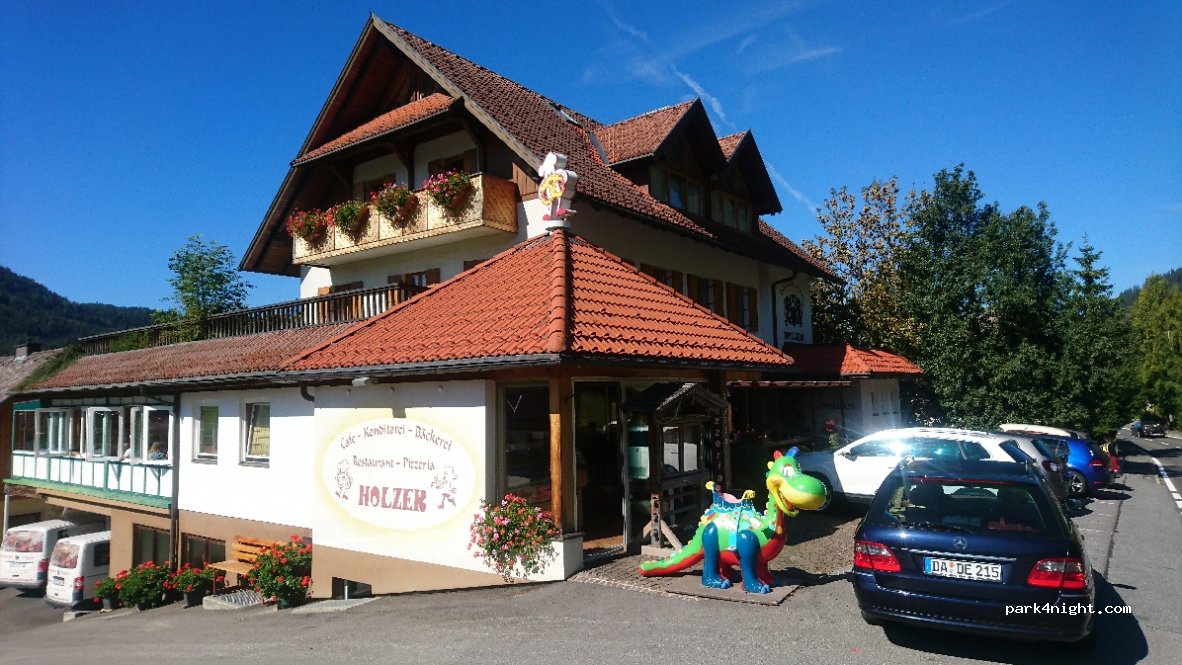 Small parking for about 6-8 vehicles, belongs to the adjacent campsite. Beach opposite. In the village very many restaurants, ATM, smaller shops. Highly recommended is the bakery, which is also a pizzeria. In summer popular place for hiking, in winter ideal ski slopes.