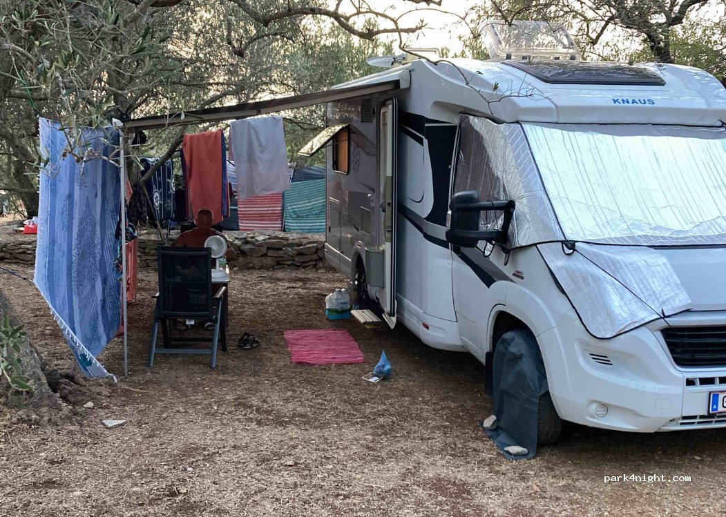 Schöner Campingplatz im Olivenhain. Olivenbäume sind eher niedrig, daher für große Wohnmobile eher wenig Stellplätze passend. Waschräume ordentlich und sauber. Betreiber sehr freundlich und hilfsbereit. Erhöhte Lage mit tollen Blick über die Insel in den Sonnenuntergang. Aber nicht direkt am Meer! Ca. 15min zu Fuß auf recht steilen Wegen.