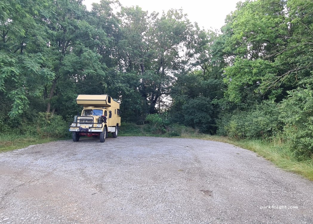 Nice quiet parking about 200 meters above the beer cellar. Ample space for 5-6 caravan / cars / buses. With panoramic views of Franconian Switzerland and the sunset.