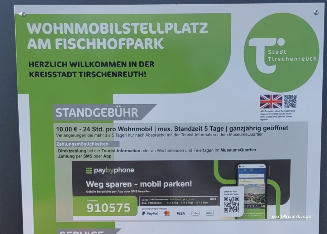 Stellplatz für Wohnmobile, Tirschenreuth Bayern, GPS 49°52' 45.869, 12°20'42.672, neue Wohnmobilanlage am See. Strom und Wasser können per EC-Karte oder mit Münzen bezahlt werden. Grauwasser kann kostenlos entsorgt werden. Das Parken kostet 10 €/24 Stunden und ist bei der Anmeldung oder im 600 m entfernten Tourismusbüro zu bezahlen. Durch das Gelände ist das Freibad der Stadt Tirschenreuth fußläufig erreichbar. Im Fischhofpark gibt es einen großen Wasserspielplatz (genannt Fischers Fritze) und das ausgezeichnete Restaurant Seenario. Im Tourismusbüro gibt es öffentliche Toiletten.