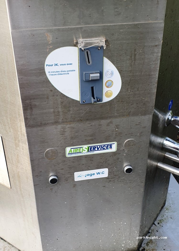 Borne fonctionne ce jour, 10' eau et 1h d'électricité pour 2€. Toute la ville parking interdit aux véhicules de plus de 5m... difficile de se garer pour une visite de la ville, hors ccar Park dispo.