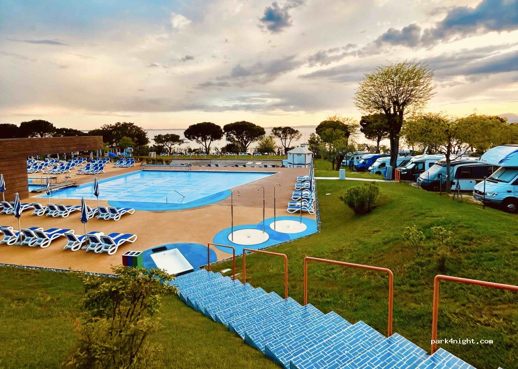 Schöner Campingplatz direkt am See, nur durch die Uferpromemade getrennt. Sanitäranlagen entsprechen deutschem Niveau. Freundliches und hilfsbereites Personal. Minimarkt, Restaurant und Pool auf dem Platz. Punktabzug für die meist kleinen und engen Stellplätze. Nix für große Camper, insbesondere wegen der niedrigen Olivenbäume.
