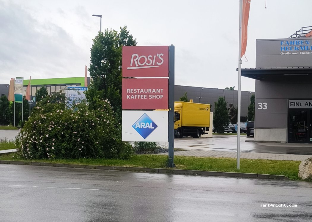 An der Aral-Tankstelle können Sie vor Rosi’s parken. Es wird bezahlt, aber wenn Sie im Abendessen essen, dann kostenlos. Ein wenig laut, aber nicht so schlimm. Die Duschen sind sauber und heiß.