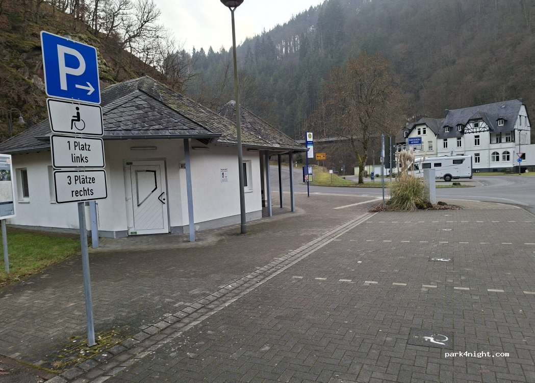 4 Stellplätze mit Strom (0,50€/KWh) auf dem vorderen Parkplatz und 4 Stellpl.mit Strom weiter hinten direkt am Bach. Dort ist auch noch Platz für weitere Mobile (ohne Strom). Ich empfehle das Parkticket in der Tour.-Info zu kaufen (10 Min. Fußweg): 3 € je Nacht und 2,20 € Kurtaxe je Person. Mobilfunk ist in Ordnung (4G bzw. LTE). Die weiteren Einrichtungen haben wir nicht benötigt. Toller Platz!