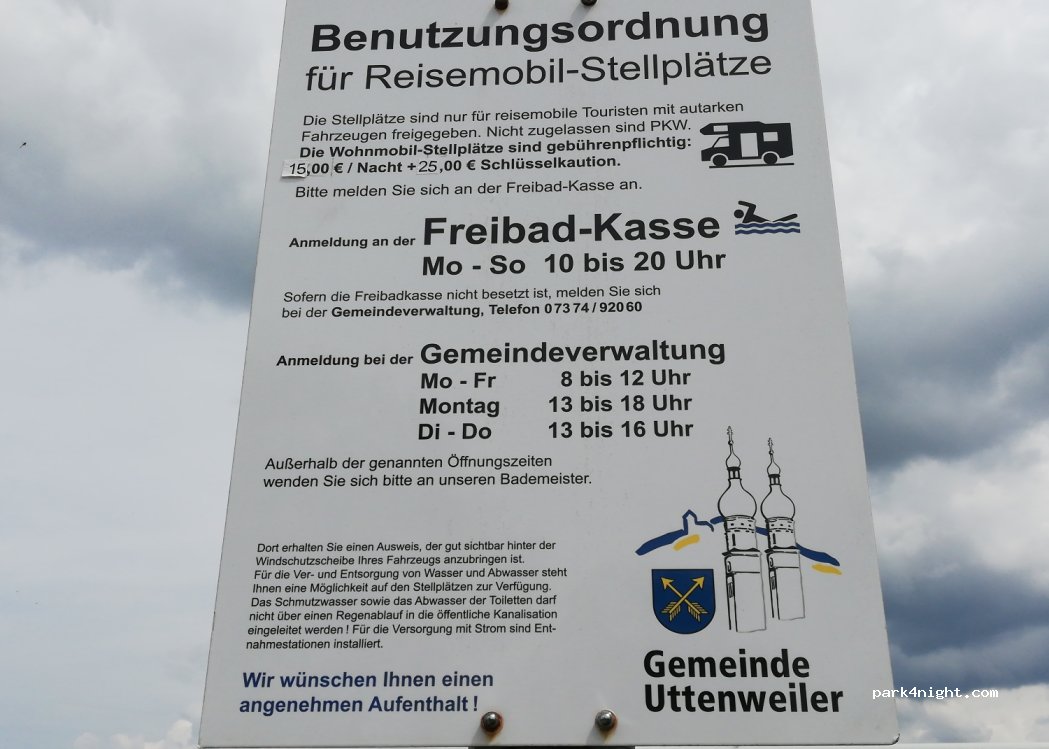 Uttenweiler at the outdoor pool. Very quiet off-season, but shaded south open terrain. Pitch for 6 mobile homes, electricity 50 cents per KWh, supply and disposal for free. In case of frost well turned off.