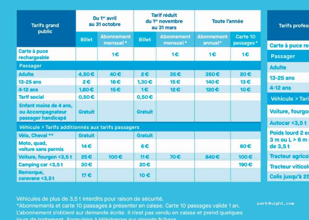 Parking bien situé et ombragé mais très bruyant la nuit. La guinguette en face est sympa mais musique et promeneurs jusqu’à au moins 1h du matin, arrêts de bus à l’entrée du parking, klaxon du ferry à chaque départ dès l’aube… Toilettes face au parking ouvertes pendant l’ouverture de la guinguette. Pas très calme !