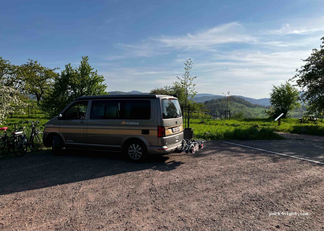 Schön gelegener Schotterparkplatz mit Blick in die Natur. Einige Sitzgelegenheiten drum herum mit Blick in die Vogesen. Es fuhren sehr viele, sehr laute Motorräder dort vorbei‘, das kann aber auch an dem verlängerten Wochenende gelegen haben, dass es besonders viele waren. Nachts ist es sehr ruhig.