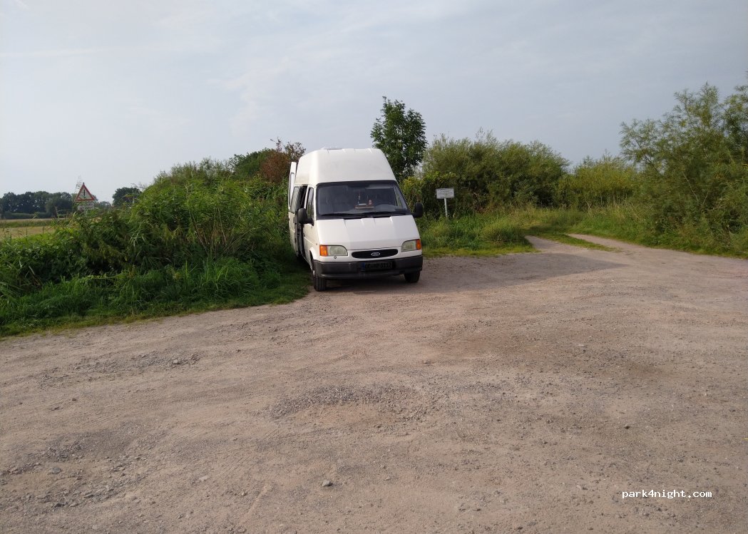 Platz für max 3 kurze Vans. Viele Hundebesitzer parken hier zum Spazieren gehen. Viele Fliegen und Mücken. Ziemlich viel Verkehr, da der Weg zur Schleuse führt. In ca. 10-15 Minuten zu Fuß ist man an der Schleuse. Die Gegend ist sehr schön, Ebbe und Flut machen einen beeindruckenden Ufergürtel. Für 1 Nacht auf jeden Fall gut.