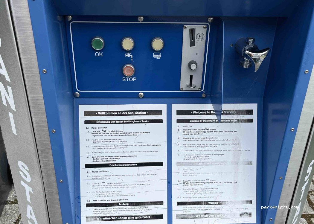 Grau Wasser kann man im großen Gulli vor der Sanistation ablassen, Trinkwasser hat nicht funktioniert, jedenfalls bei mir nicht. Ich habe es zweimal versucht. Schwarz Wasser klappt prima.