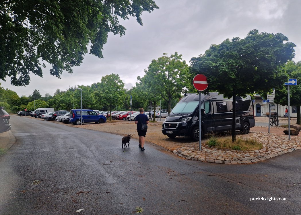 Parkplatz am kleinen Bahnhof mit ausgewiesenen Stellplätzen. Nichts für Dickschiffe. Genau das Richtige für uns. Innenstadt in 5 Minuten zu Fuss erreichbar. Mehr brauchen wir nicht.