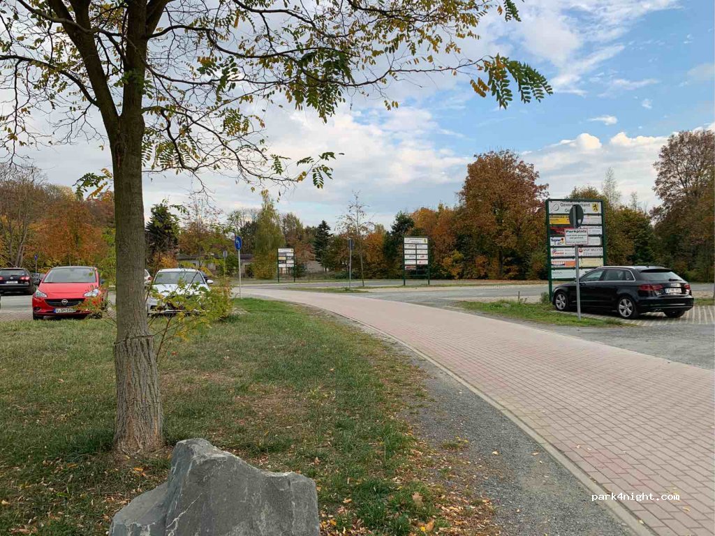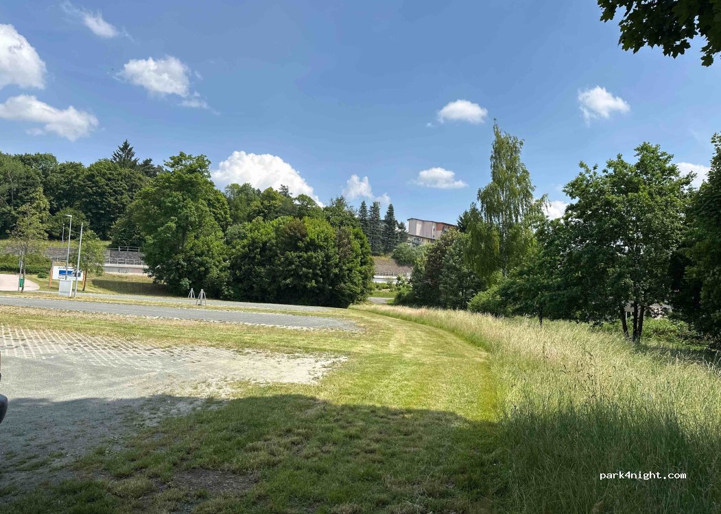 Grote parkeerplaats aan de rand van de stad. Er zijn vier betaalde parkeerplaatsen voor stacaravans met stroomzuilen, te betalen via een QR-code, hier Visa, Mastercard en nu ook PayPal. Verwarmd buitenzwembad (alleen in de zomer geopend) en een bakker/café in de directe omgeving. Lopen naar de stad ongeveer 10 minuten, Voigtsberg Castle ongeveer 30 minuten.