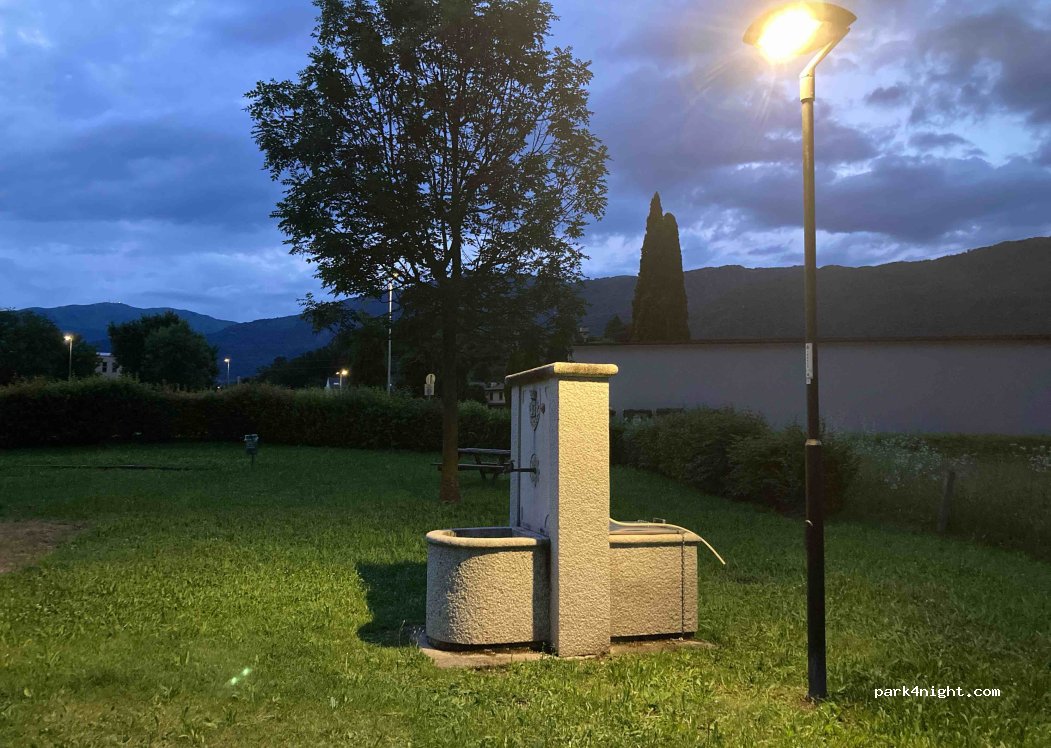Aire de repos sans services, avec fontaine d'eau potable, le parkimètre est présent mais en réalité il est éteint, donc aujourd'hui il est gratuit. Très pratique au centre