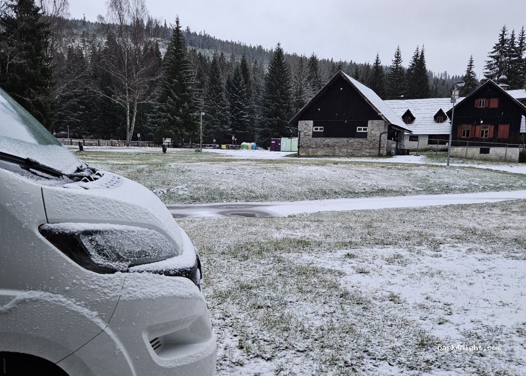 This camp is owned by the municipal office in Srní. During winter services like toilet or water are closed, but you can still park here for 200kč/night and you can buy electicity for another 200kč. In winter you are here moreless alone which has an atmosphere too. Nerby is river. Great place for walk to Horská Kvilda (4km) or Modrava (3km). I wonder how it is during summer here.
