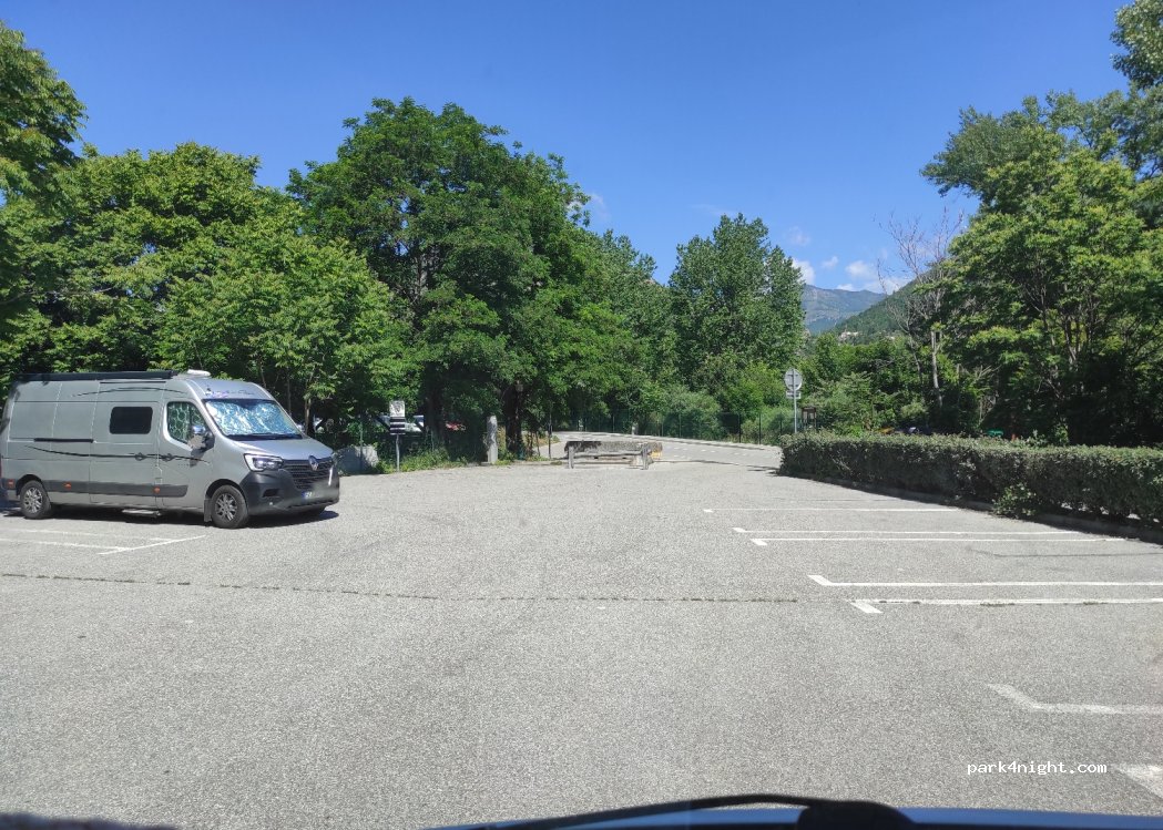 Aire de service avec eau gratuite et stationnement gratuit jour et nuit, calme, commerce à proximité. Parfait pour prendre le train des Pignes.