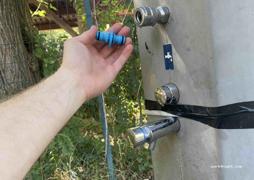 Für oberen Hahn Adapter notwendig. Siehe Foto. Unten ohne Gewinde. Kostenloses Wasser. Stellplatz für eine Nacht völlig ok.