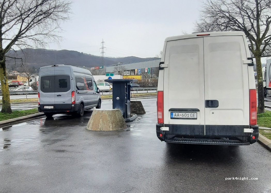 Grand parking de station essence. Mieux que le parking simple quelques kilomètres avant, avec des voitures stationnant venues des banlieues françaises, et des gens pas fréquentables. Un problème récent en Suisse. Je comprends pourquoi les Suisses n’aiment pas les français. Sinon une borne vidange et eau pour camping-cars se trouvent sur ce parking.