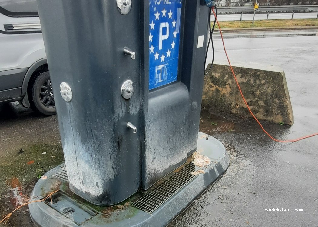 Excellent service area, I drained the dirty water and filled it with water. I had a nice hot shower (5fr). In the morning I bought hot bread. I spent a calm night