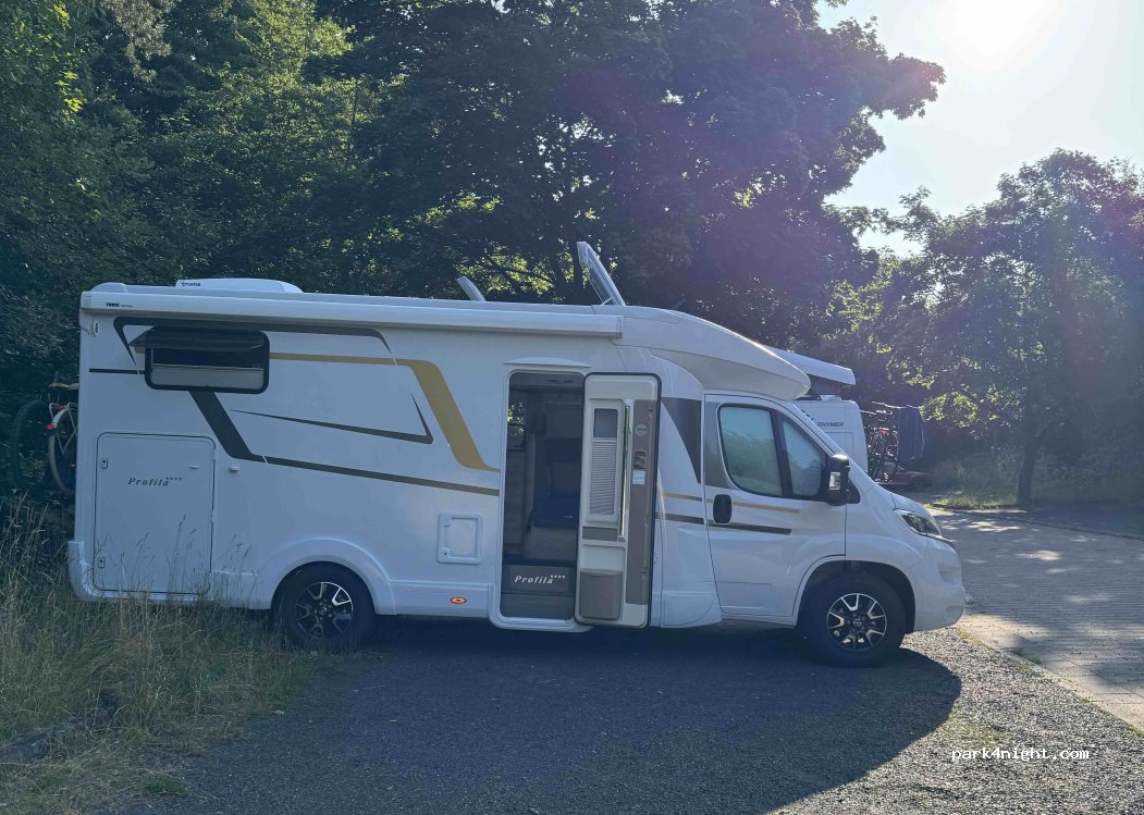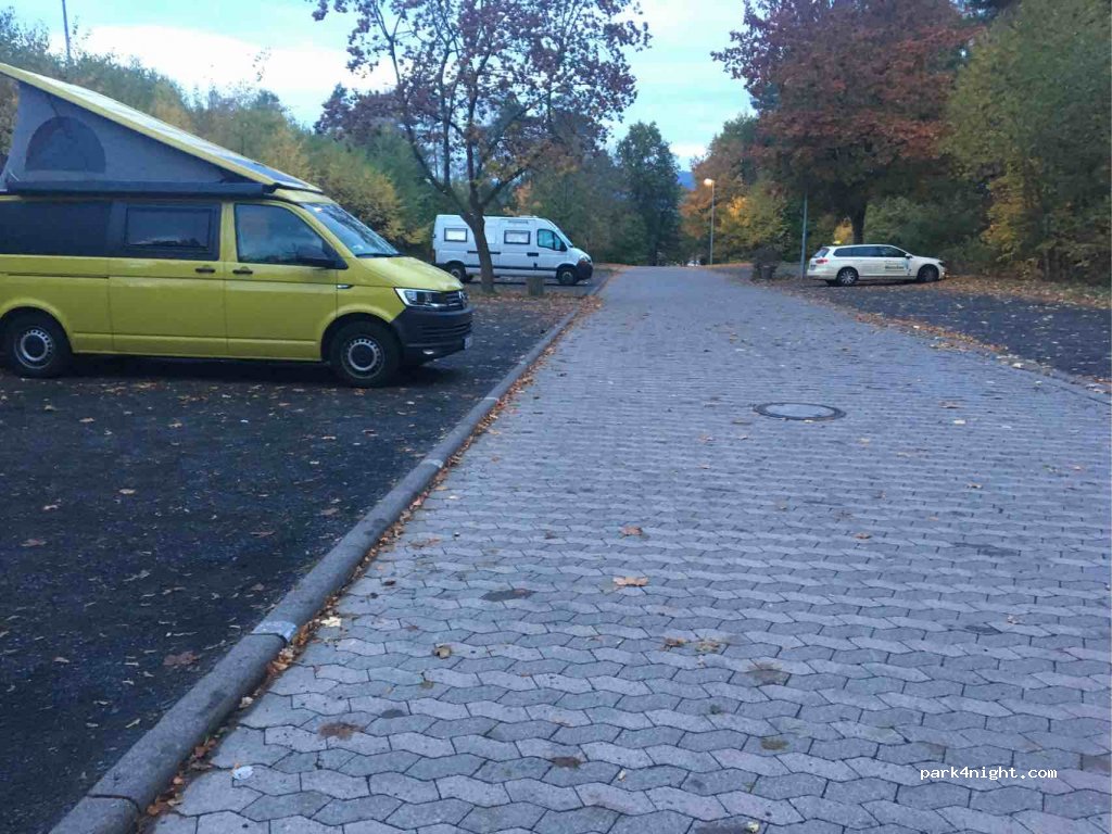 Lauschiger, etwas versteckter Parkplatz zwischen Waldschwimmbad und Sportheim. Geschottert und sehr eben. Tipp: bei Eingabe „Todi-Allee“ ins Navi schickt es euch zu weit in den Wald. Am Schwimmbadeingang vorbei und VOR dem 3,5t Sackgasse-Schild rechts, dann sofort wieder links an der Tafel des Turnvereins. Zufahrt mit 7,5 Teilintegriertem kein Problem.
