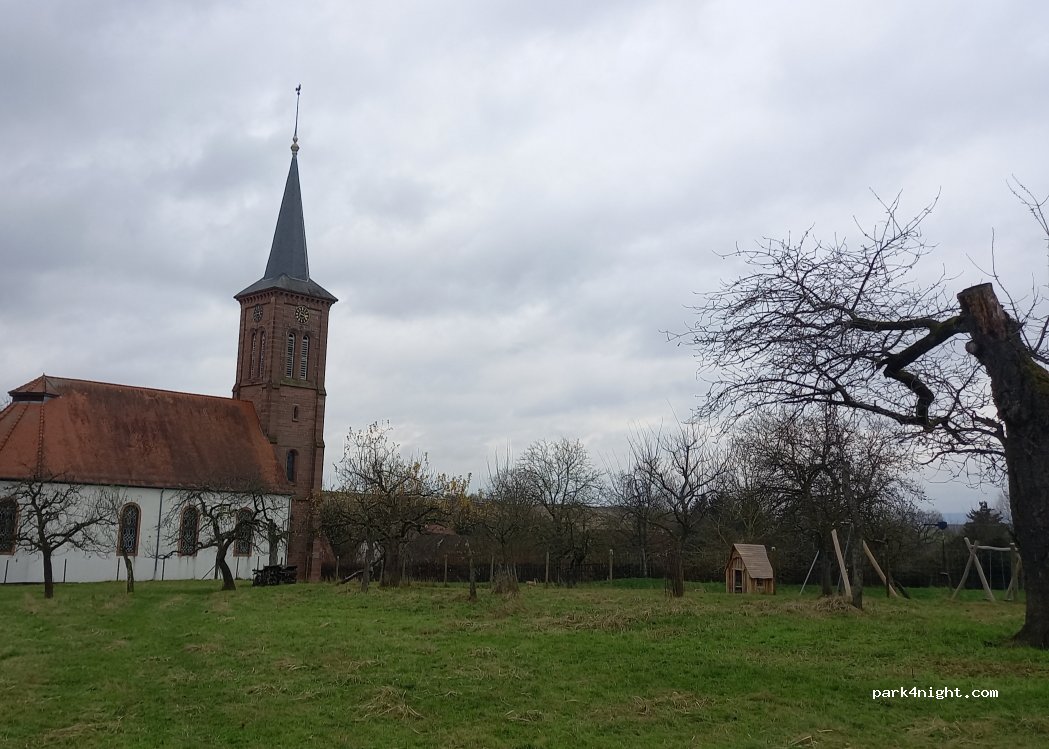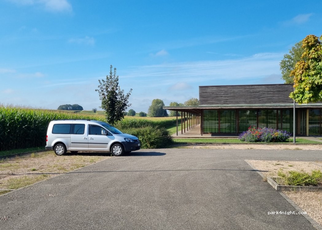 Nuit calme sur parking goudronné. Les gens sont très gentils, à l'Office du tourisme la personne est très sympa et compétente. N'hésitez pas à prendre le pain à la boulangerie du village. Il est délicieux comme les tartes flambées. A la place principale, goûtez les pommes en vente libre (2 €/2 kg à mettre dans la boîte à lettres.