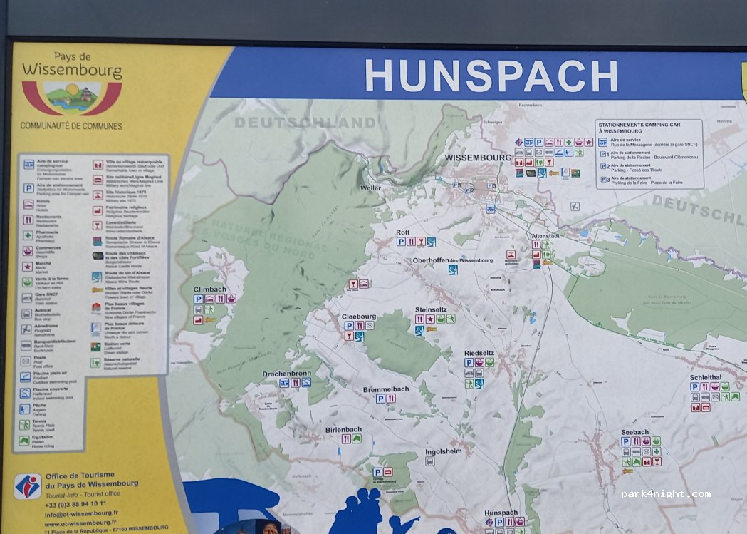 Un parking simple est disponible sur place. Hunspach est classé parmi les plus beaux villages de France. Des poubelles se trouvent à proximité. Pas de point d'approvisionnement ni d'évacuation.