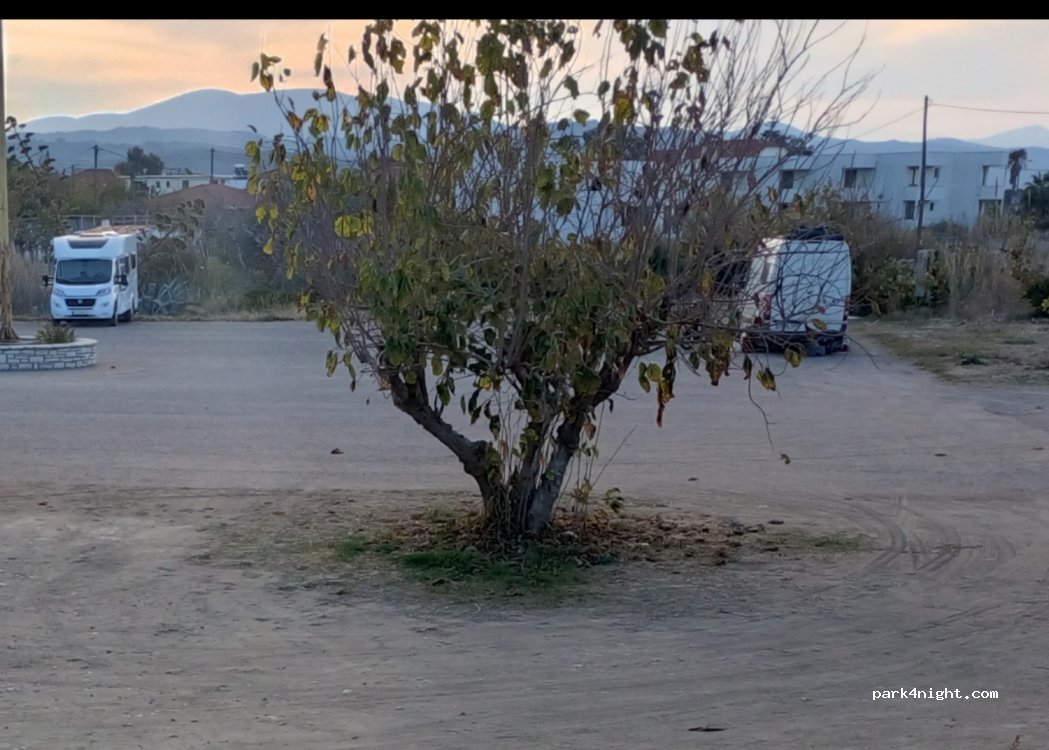Waren zuerst vorne auf dem Parkplatz, auch gut, aber hier steht man den einheimischen nicht im Weg.Schöner Platz, Tavernen in der Nähe, morgens um neun kommt sogar der Bäcker vorbei, mehrer Dusche und Müllcontainer da! Nachts wie leider fast überall Hundegebell