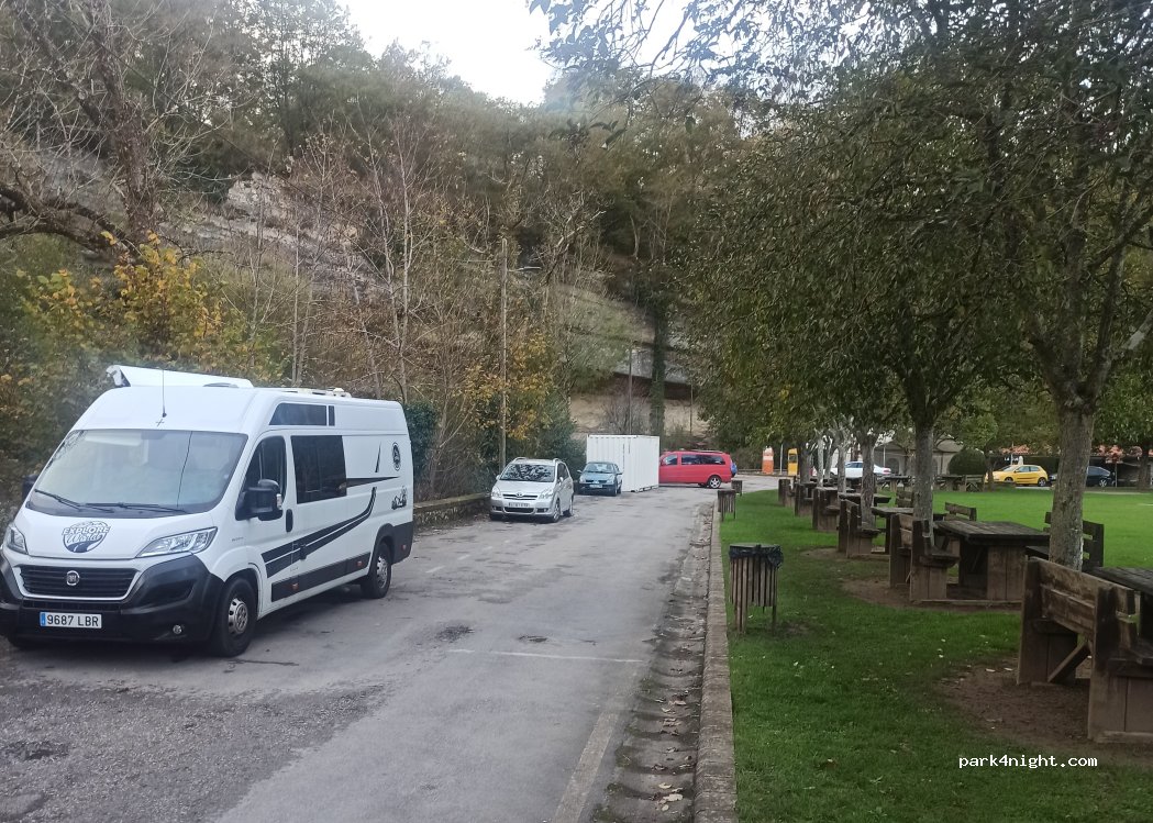 Inservible para furgos y autocaravanas. No existe aparcamiento, los coches aparcan a un lado del camino. Se emplea por los lugareños como pic-nic. Cuando llegamos estaba a tope de gente pasando la tarde con la familia. Para echar un rato con los niños quizás pero no para más.