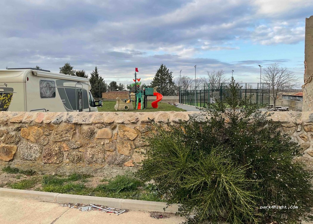 parking muy cómodo con servicios de descarga gratuitos y carga de luz y agua de pago. con pista de pádel, fútbol y baloncesto delante y un estupendo parque. Hay un camino a Navafria para ir andando o em bici sin coches, muy agradable. La pena es que en el pueblo no hay nada abierto, ni un bar.