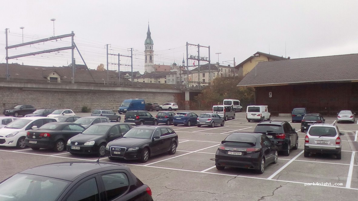 Grosser Parkplatz sehr zentral, neben der Bahnlinie. Von 19 - 8h und am Wochenende gratis. Ideal für eine Stadtbesichtigung. Man kann hier auch schlafen, aber der Parkplatz neben dem Schwimmbad ist angenehmer.