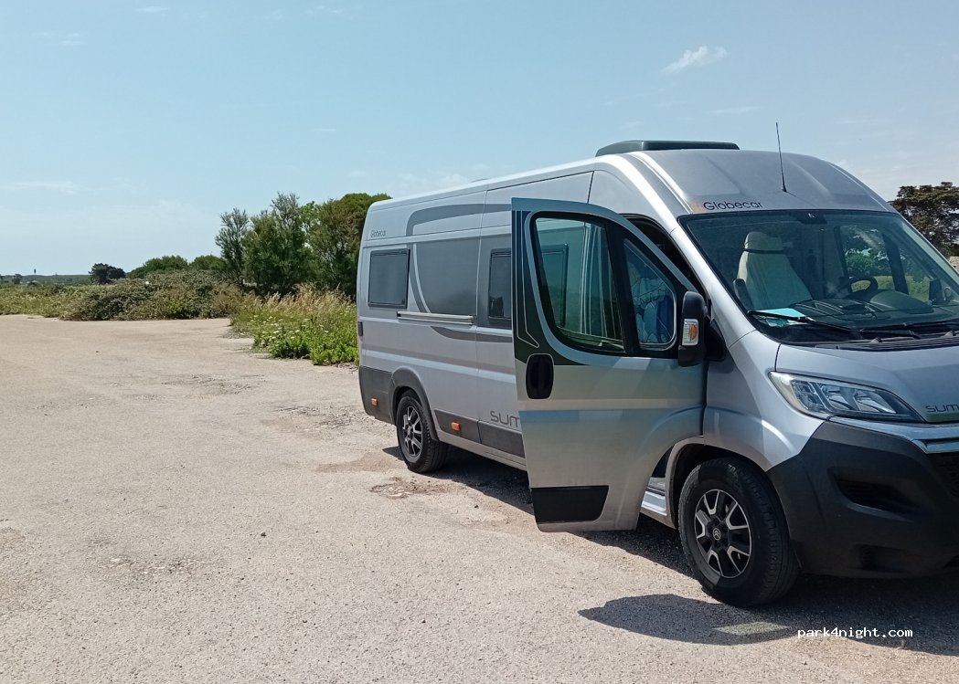 Ampio parcheggio non molto pulito a 200 metri dalla spiaggia, possibilità di pernottamento molto tranquilla. Cammina lungo il molo.