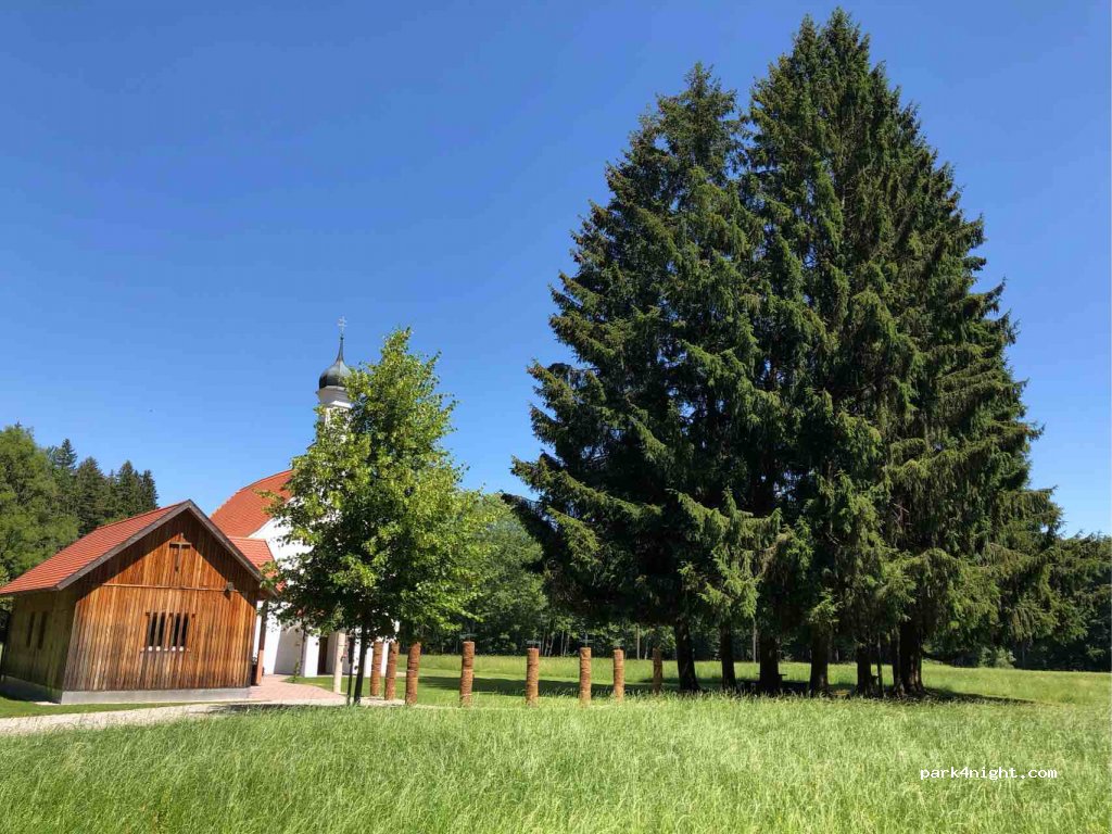 Angenehm und ruhig. Neben einer kleinen Kapelle. Wanderwege durch den Wald. Nahe an Straße.
