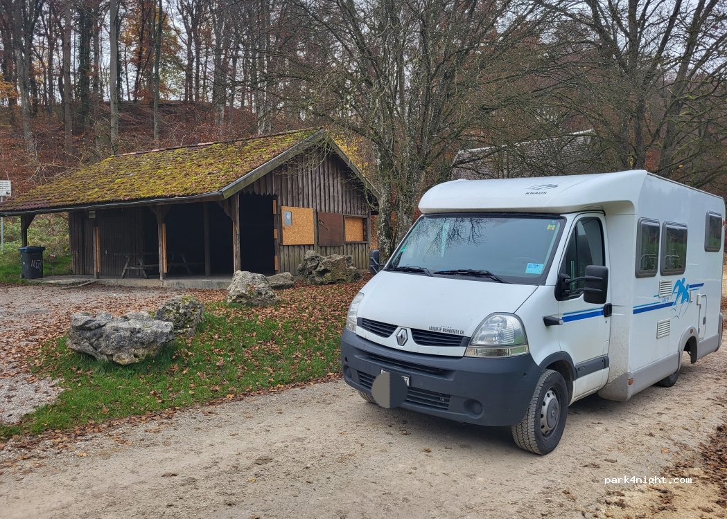 Parking on gravel in the forest, near a sports field. Cabin with barbecue nearby. Very quiet at night and especially safe! Ideal for one night. Starting point for marked hikes and Nordic hikes.