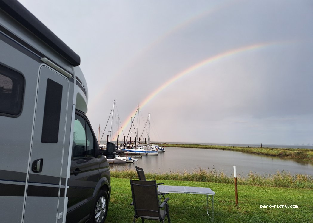 Schöner Platz - hatten Glück und standen in der 1. Reihe. Ein Traumblick auf Yachthafen und Nordsee. Bezahlung unkompliziert im Briefumschlag. WC- Entsorgung neben Sanitärgebäude jederzeit zugänglich. Wassertanken an einem Hahn am Platz möglich. 19€ für mich ok. 2€ Dusche - wem zu teuer - dann duscht im Womo, genauso der Abwasch. Ansonsten bitte Campingplatz anfahren. — Wir kommen wieder.