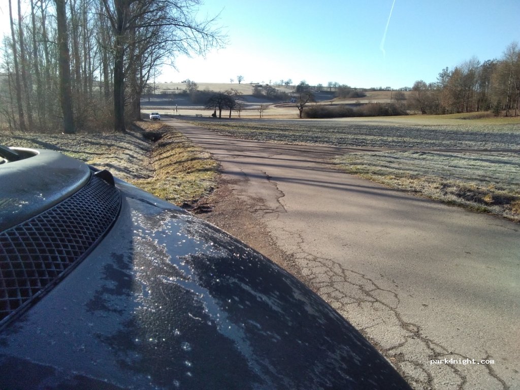 Waldparkplatz für 1 bis 2 Fahrzeuge. Leicht anzufahren. Untergrund Schotter, abschüssig. Größtenteils sonnig, unbeleuchtet. Sehr ruhig am Waldrand abseits der Ortschaft. Hütte mit Grillstelle 100 m entfernt. Tagsüber gut besucht von Spaziergängern.