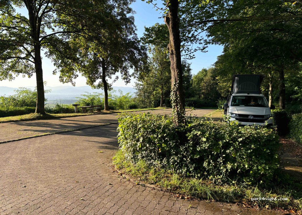 Schöner befestigter Parkplatz mit toller Aussicht. Es gibt einen Mülleimer und mehrere Bänke und Tische. Tagsüber waren einige Familien mit Kindern da, weil direkt nebendran ein kleiner Spielplatz ist. Abends relativ ruhig. Wir haben ein mal ein Auto gehört. Zufahrt über Eichstetten. Über Bahlingen geht, ist aber nur für landwirtschaftlichen Verkehr legal. Alle Einheimischen fahren da lang.