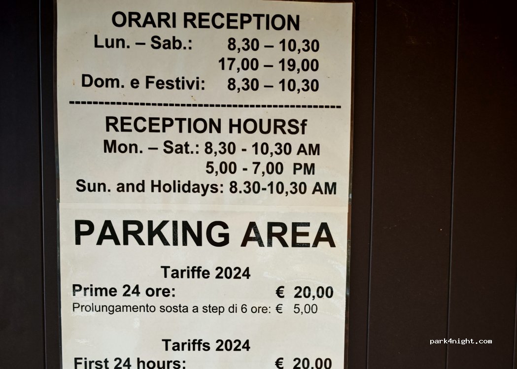 Après les terrains de jeux (panneau Stadio di Rugby), tourner à gauche, marcher jusqu'au bout. Bloc sanitaire avec douches, bouteilles GPL, salle de détente avec TV, distributeur de boissons chaudes et froides. 16 bornes électriques ouvertes toute l'année, pass d'accès à l'arrivée. Environ 600 m du bus. C'est un bon 6 km du centre en vélo. Toutes les prestations possibles pour un mobil-home. A noter que juste à l'entrée de cette zone se trouve un grand parking, gratuit mais non gardé et sans services.